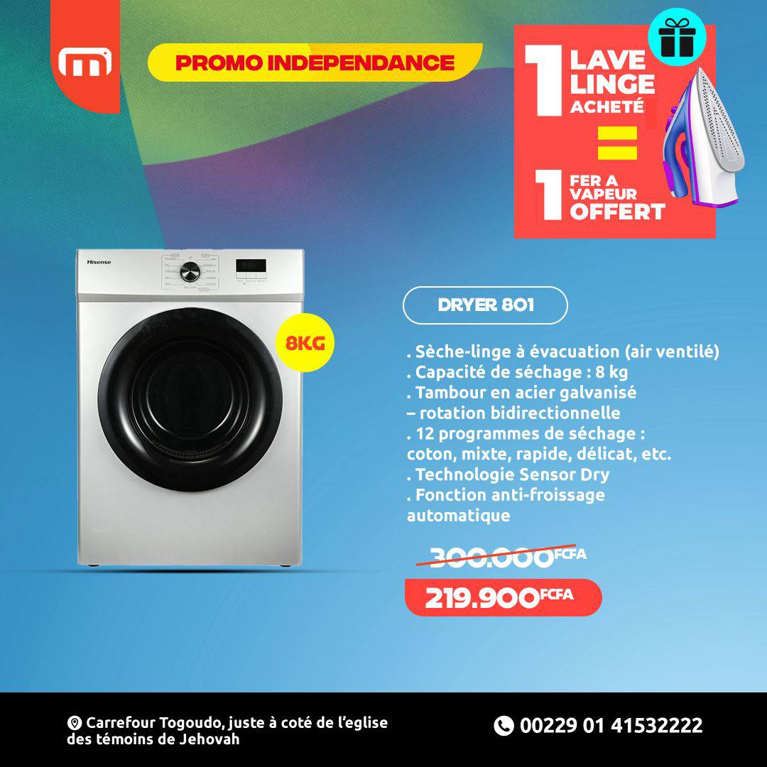 Le Hisense DRYER801 est un sèche-linge frontal 8 kg, idéal pour les foyers de taille moyenne. Conçu pour sécher rapidement et efficacement vos vêtements, il combine performance, économie d’énergie et facilité d’utilisation.