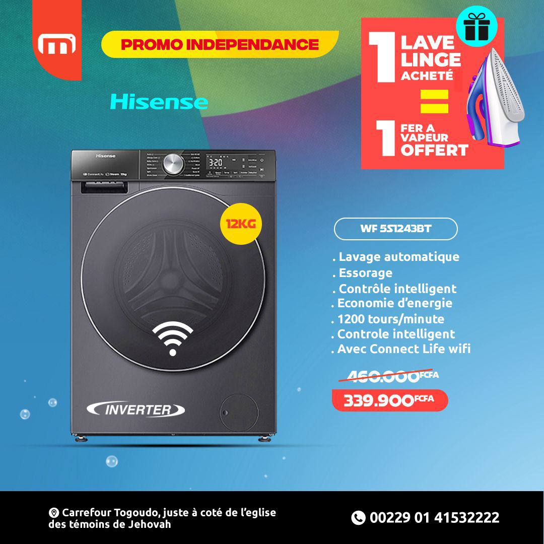 La Hisense WF5S1243BT offre une combinaison parfaite de capacité, technologie et confort d’utilisation, pour un linge toujours propre, frais et soigné.
