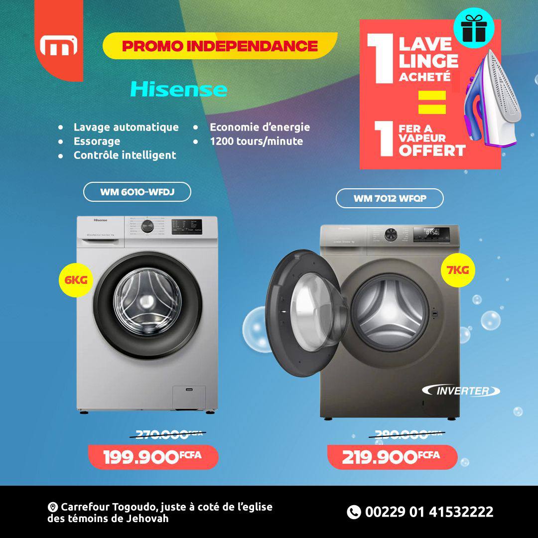 Les Hisense WM6010-WFDJ (6 kg) et WM7012-WFQP (7 kg) sont des lave-linge frontaux compacts et efficaces, adaptés aux petits et moyens foyers. Ces modèles offrent des cycles de lavage variés pour tous types de textiles, tout en garantissant une consommation optimisée d’eau et d’électricité.